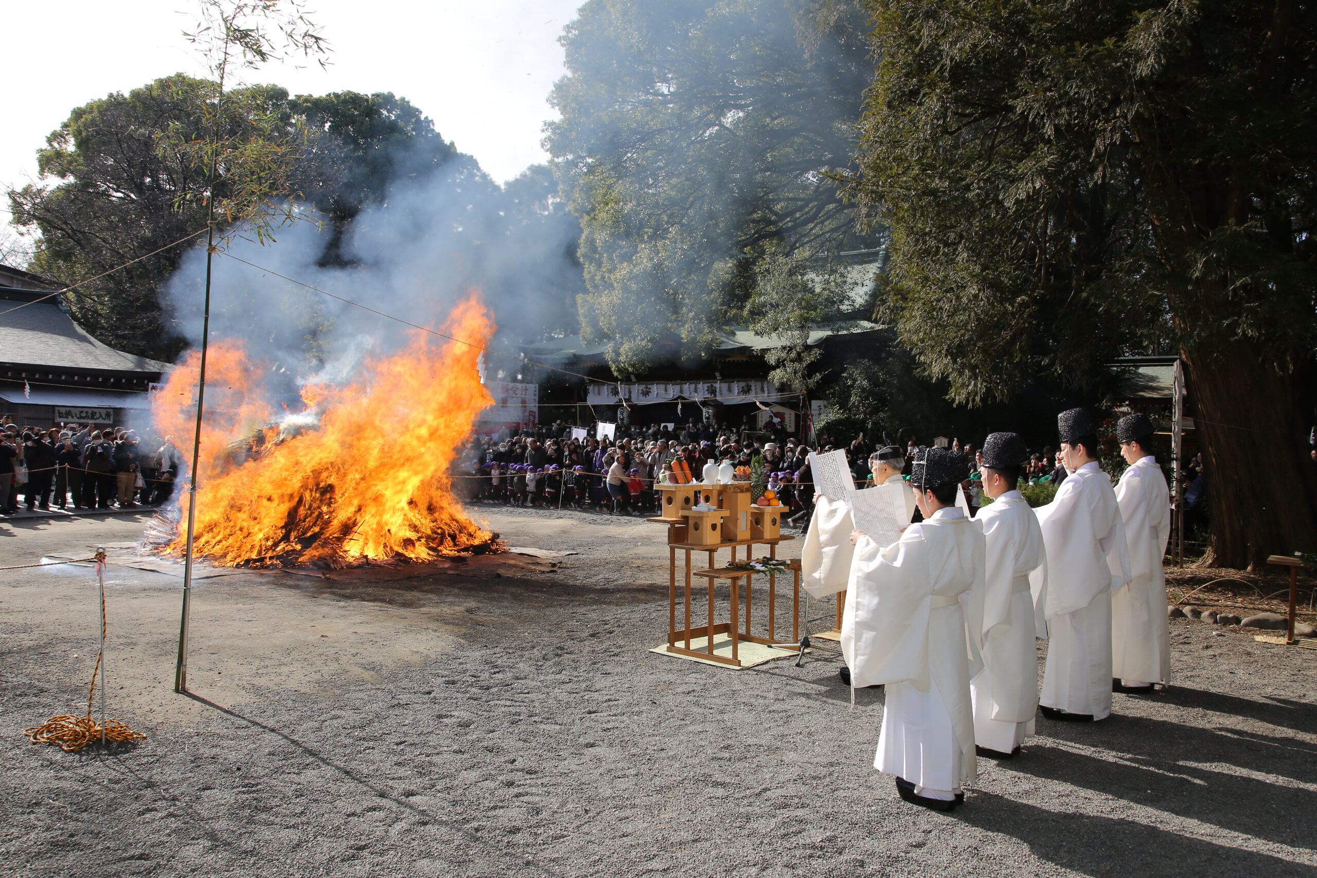 当宮では小正月の1月15日の午前10時より、ご神前で「月次祭並びに古神札焼納奉告祭」を執り行い、午前11時半より社殿前広場の特設斎場にて古神矢・古神札等焼納祭(とんど焼)を斎行致します。 初詣の参拝者の方々が納められた古い矢やご神札・お守り・注連縄等をうず高く積み上げ、祭典にてお祓いをした後、火鑽(ひきり)神事が行われます。これは轆轤鑽(ろくろひきり)を使って古式そのままに火を熾(お)こす神事です。このご神火を用いて、積み上げられた古神矢・古神札等に点火され、燃え盛るお焚上げの前で神職・参列員等が大祓詞を奏上し、昨年一年間お護り戴いた感謝と今年一年の除災招福を祈ります。