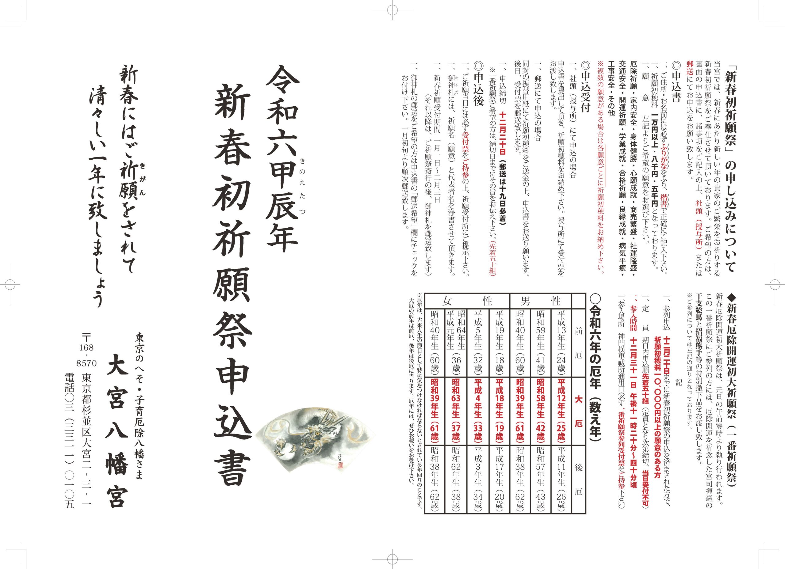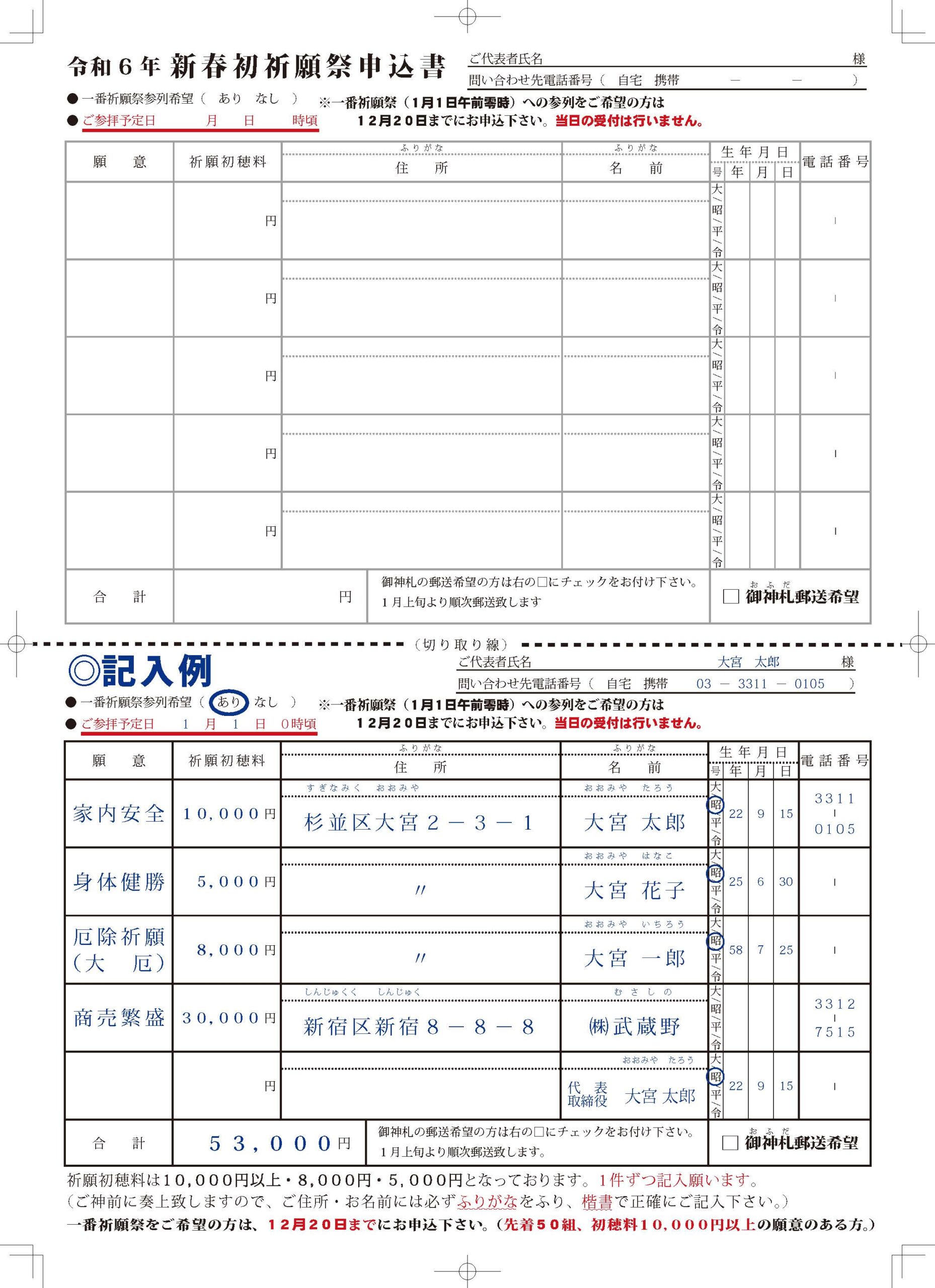 ⬜新春初祈願(元日~2月3日迄)をご希望の方も12月1日~20日の間で受付をしておりますので下記PDFをダウンロードのいただき、必要事項と参拝予定日を記載の上、授与所にてお申し込みいただくか、郵送にてお送り下さい。【締切り12月20日】